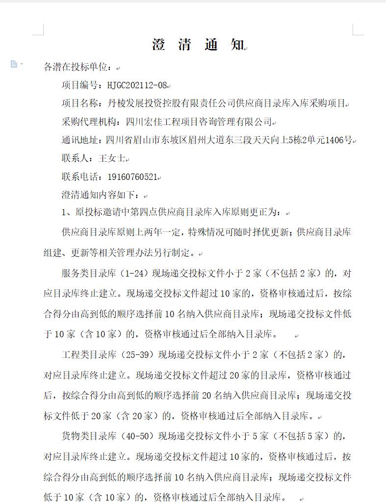 【丹發(fā)展公司】丹棱發(fā)展投資控股有限責(zé)任公司供應(yīng)商目錄庫入庫采購項目澄清通知