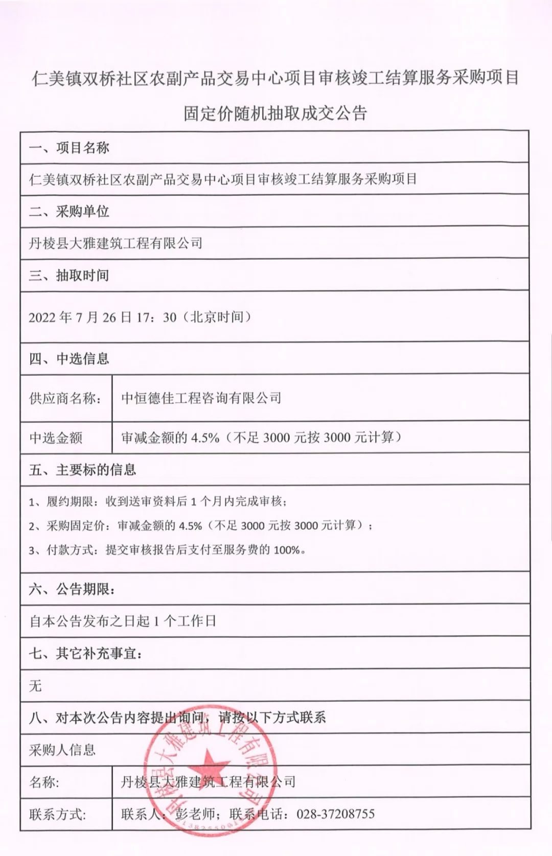 仁美鎮(zhèn)雙橋社區(qū)農(nóng)副產(chǎn)品交易中心項(xiàng)目審核竣工結(jié)算服務(wù)采購項(xiàng)目固定價(jià)隨機(jī)抽取成交公告