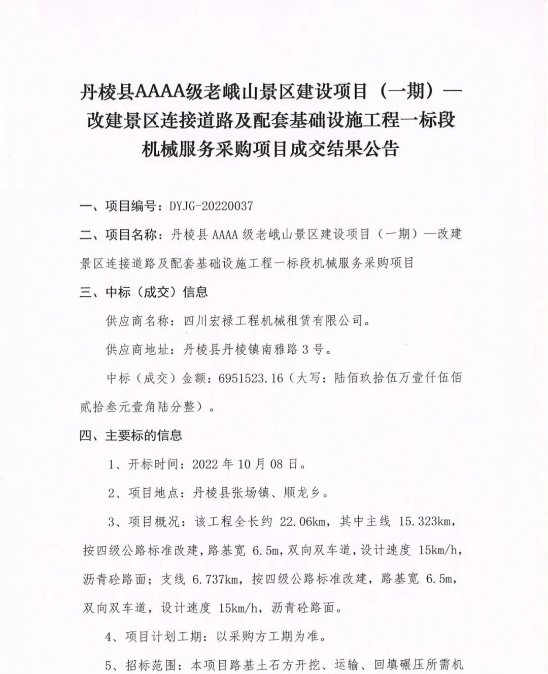 丹棱縣AAAA級老峨山景區(qū)建設(shè)項目(一期)--改建景區(qū)連接道路及配套基礎(chǔ)設(shè)施工程一標段機械服務(wù)采購項目成交結(jié)果公告