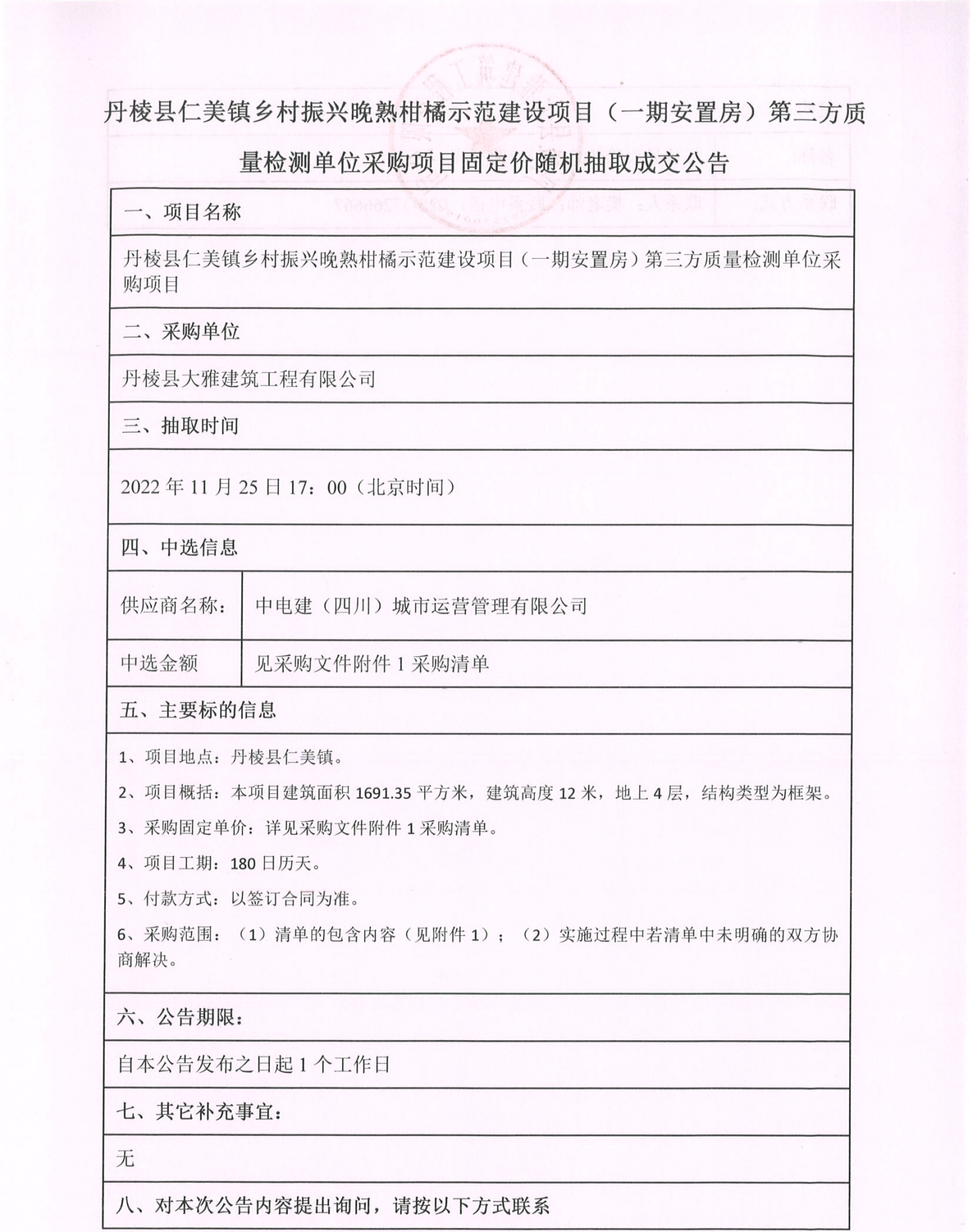 丹棱縣仁美鎮(zhèn)鄉(xiāng)村振興晚熟柑橘示范建設(shè)項目(一期安置房) 第三方質(zhì)量檢測單位采購項目固定價隨機(jī)抽取成交公告