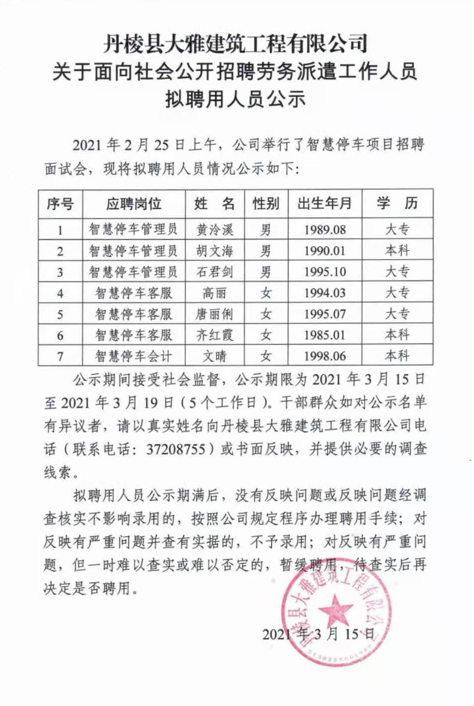 【大雅建筑公司】關(guān)于面向社會(huì)公開招聘勞務(wù)派遣工作人員擬聘用人員公示