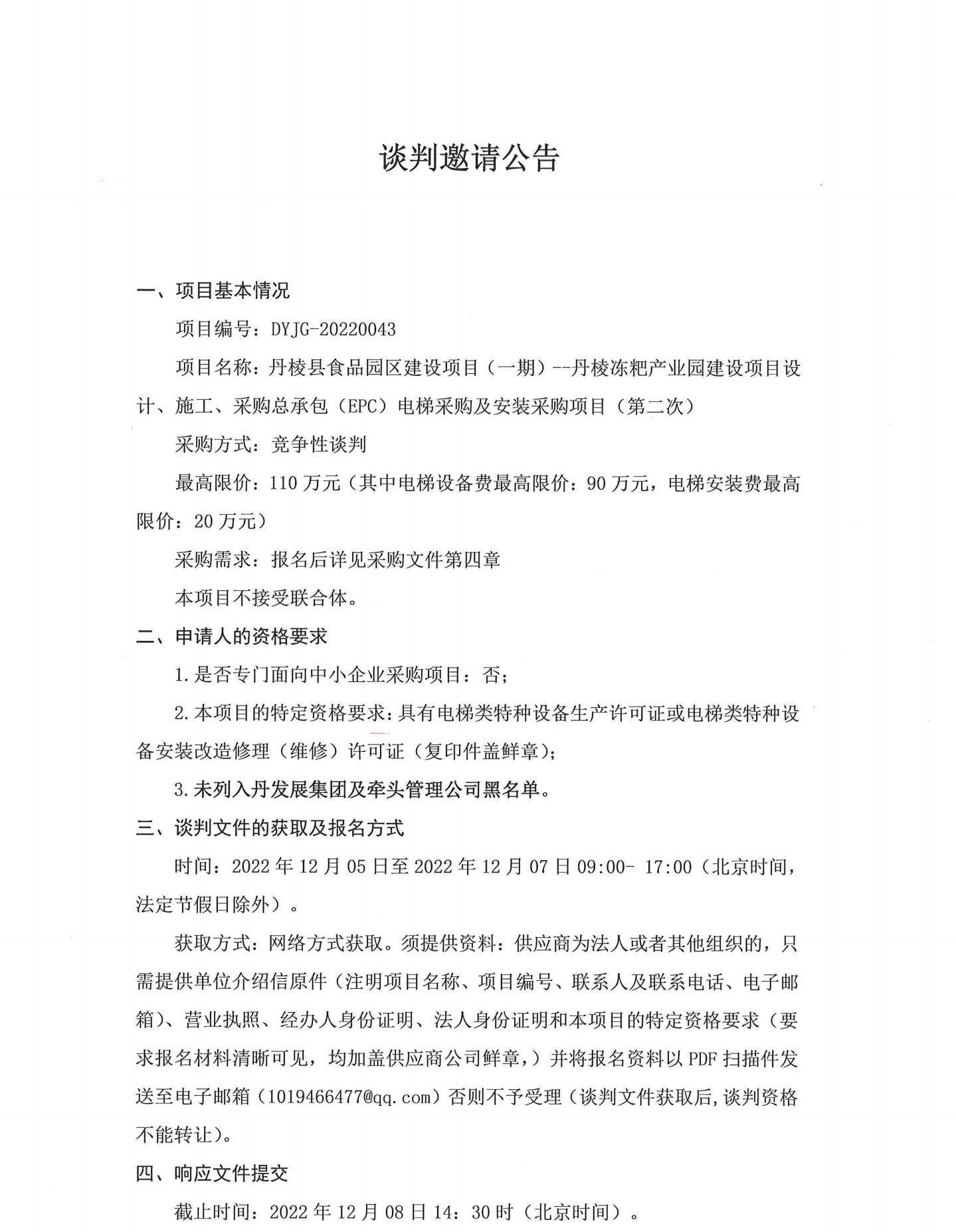 丹棱縣食品園區(qū)建設(shè)項(xiàng)目 (一期)--丹樓凍把產(chǎn)業(yè)園建設(shè)項(xiàng)目設(shè)計(jì)、施工、采購(gòu)總承包 (EPC) 電梯采購(gòu)及安裝采購(gòu)項(xiàng)目 (第二次)談判邀請(qǐng)公告